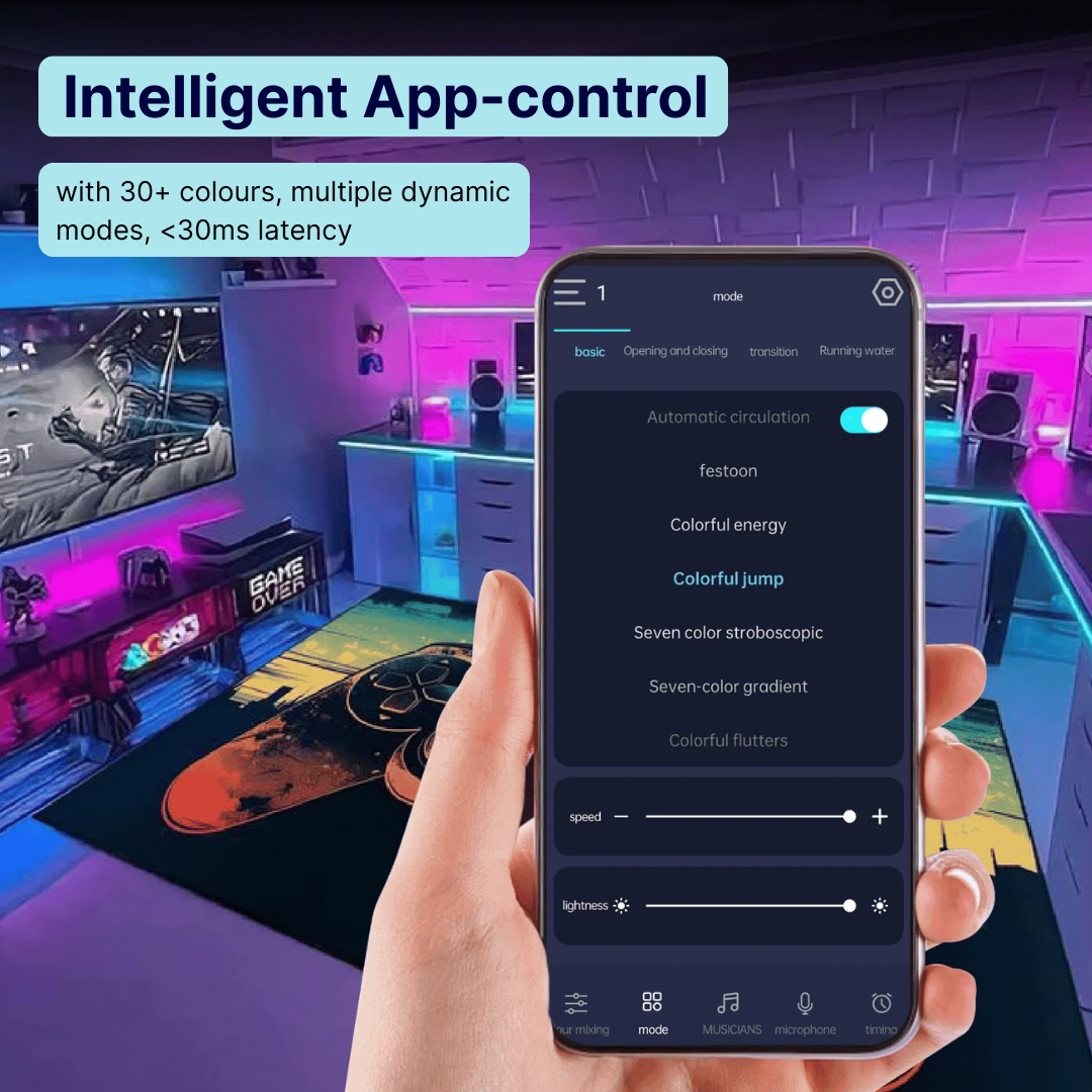 Unlike basic LED strips, our Smart Light uses RGBIC technology, which means you get gradients, waves, and dynamic color flows—all in one strip. It's lighting that moves, reacts, and sets a tone.